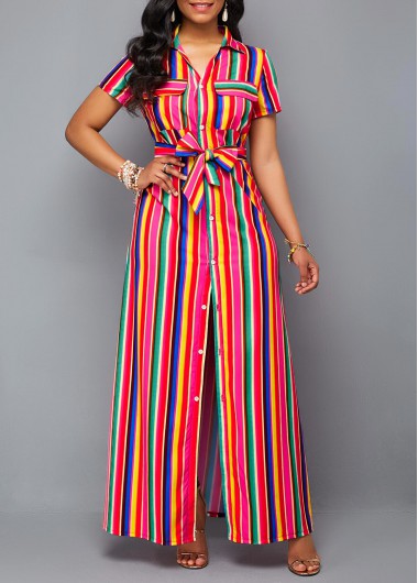 Belted Turndown Collar Button Up Rainbow Color Dress