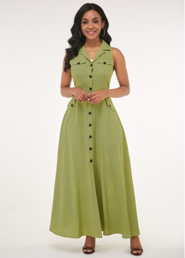 Side Pocket Button Up Turndown Collar Maxi Dress