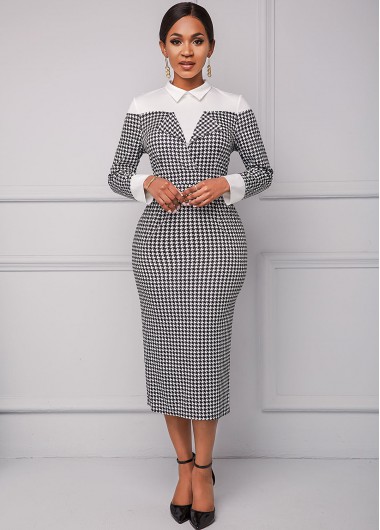 Long Sleeve Houndstooth Print Turndown Collar Dress