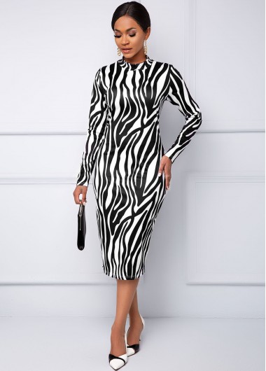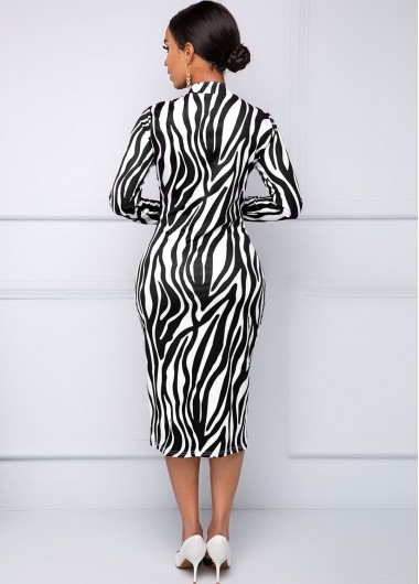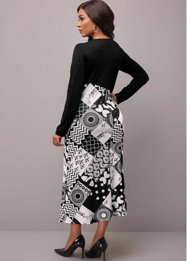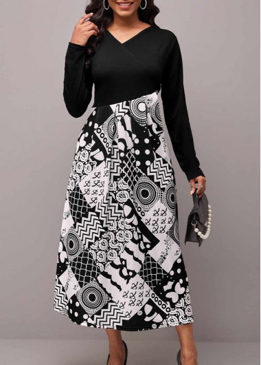 Printed Long Sleeve V Neck Black Dress