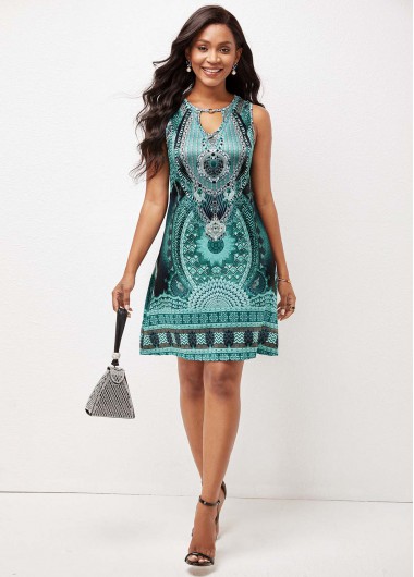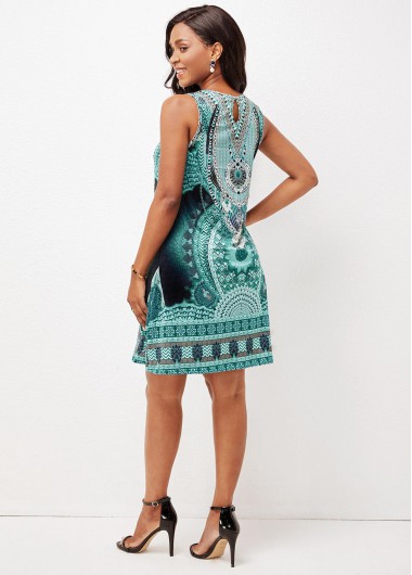 Tribal Print Green Round Neck Dress