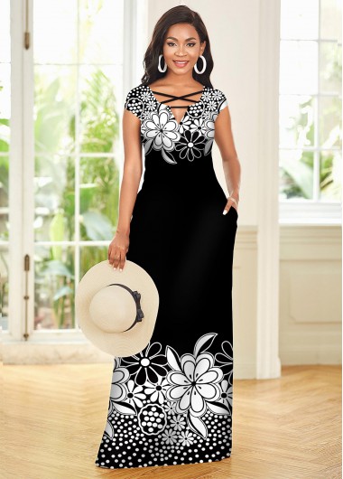 Black Printed Button Detail V Neck Dress