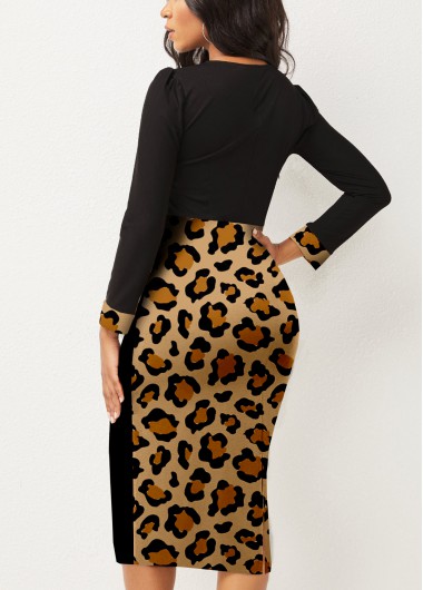Leopard Bowknot Puff Sleeve Color Block Dress