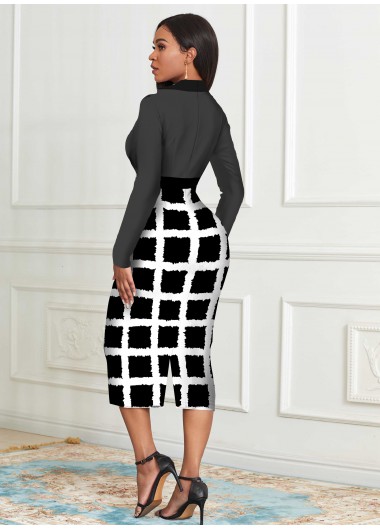 Round Neck Houndstooth Print Long Sleeve Mermaid Dress