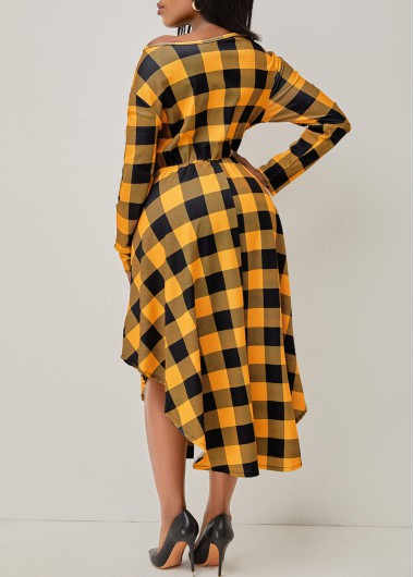 Plaid Asymmetric Hem Long Sleeve Dress