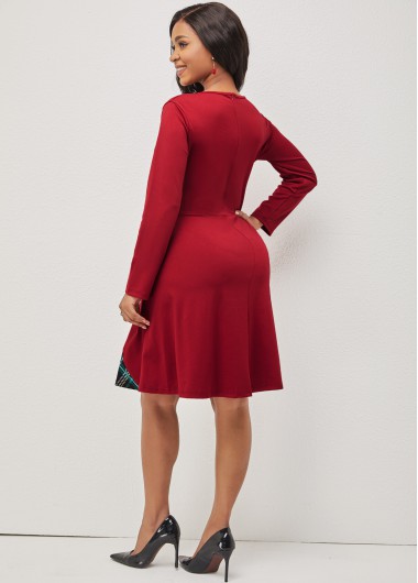 Geometric Print Flare Sleeve Round Neck Red Dress