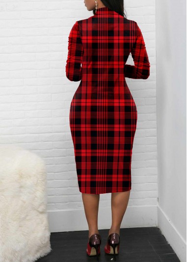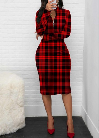 Quarter Zip Long Sleeve Plaid Red Bodycon Dress